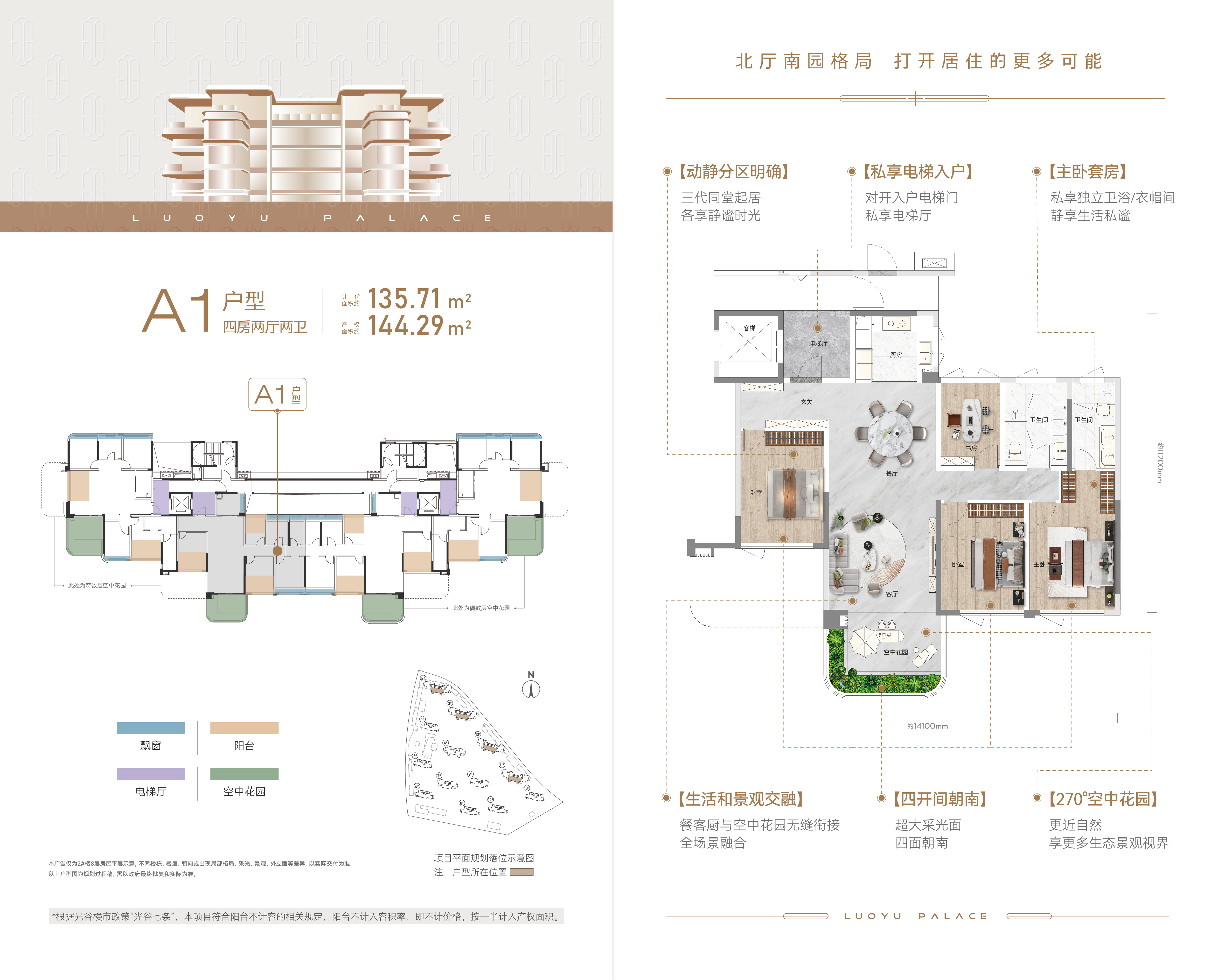 私享电梯入户:对开入户电梯门 私享电梯厅 四开间朝南:超大采光面 四面朝南 动静分区明确:三代同堂起居 各享静谧时光 270°空中花园:更近自然 享更多生态景观视界 生活和景观交融:餐客厨与空