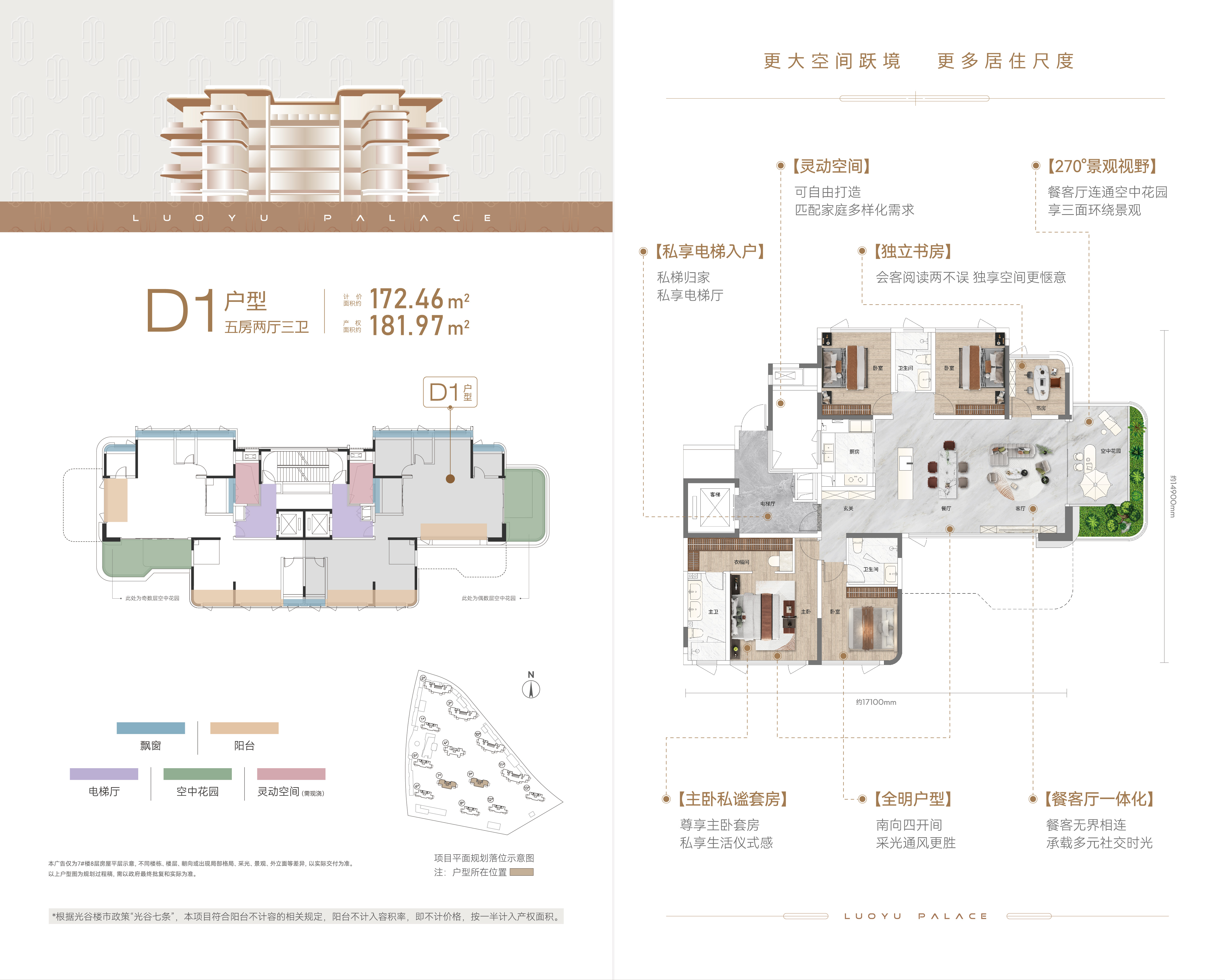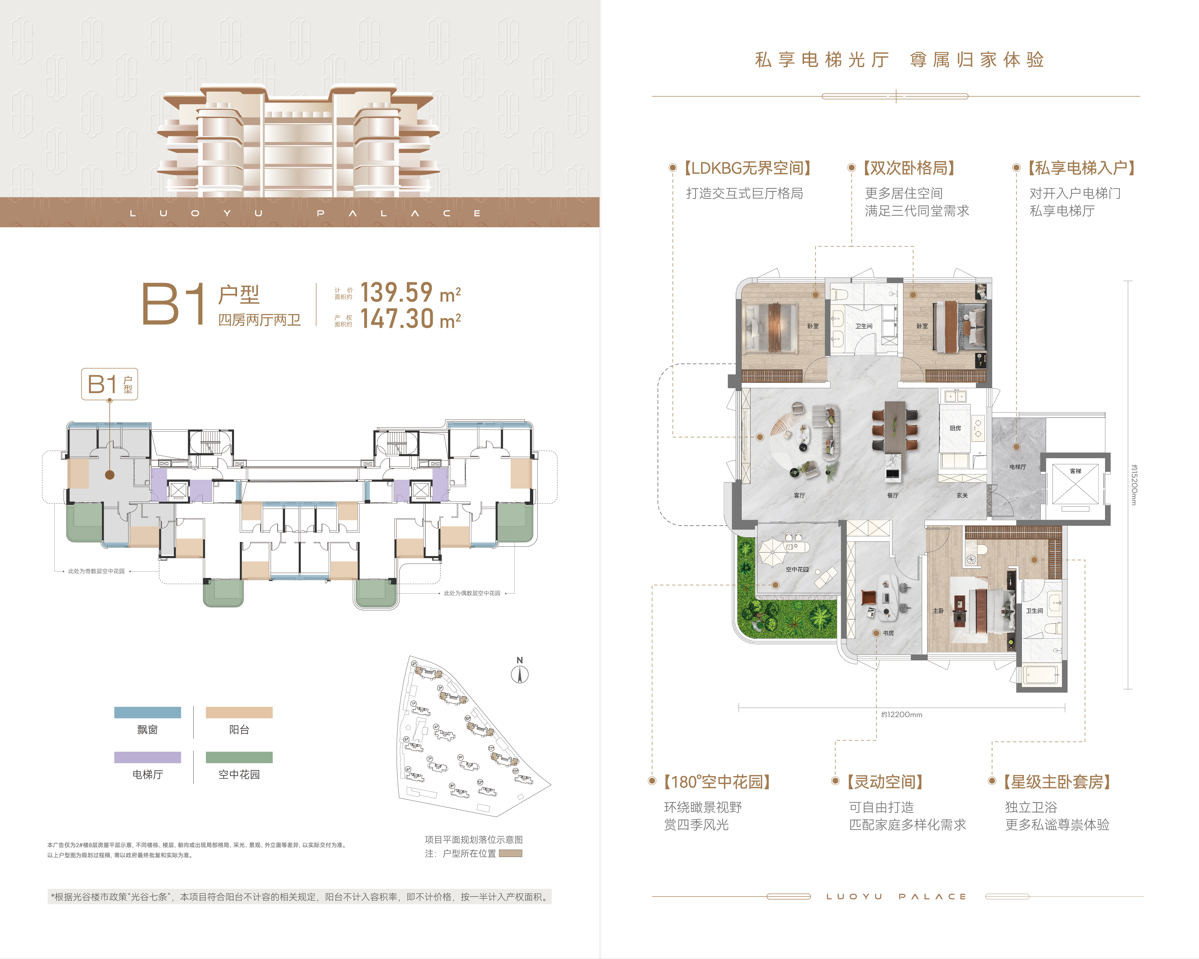 私享电梯入户:对开入户电梯门 私享电梯厅 星级主卧套房:独立卫浴 更多私谧尊崇体验 LDKBG无界空间: 打造交互式巨厅格局 180°空中花园:环绕瞰景视野 赏四季风光 双次卧格局:更多居住空间 满足三