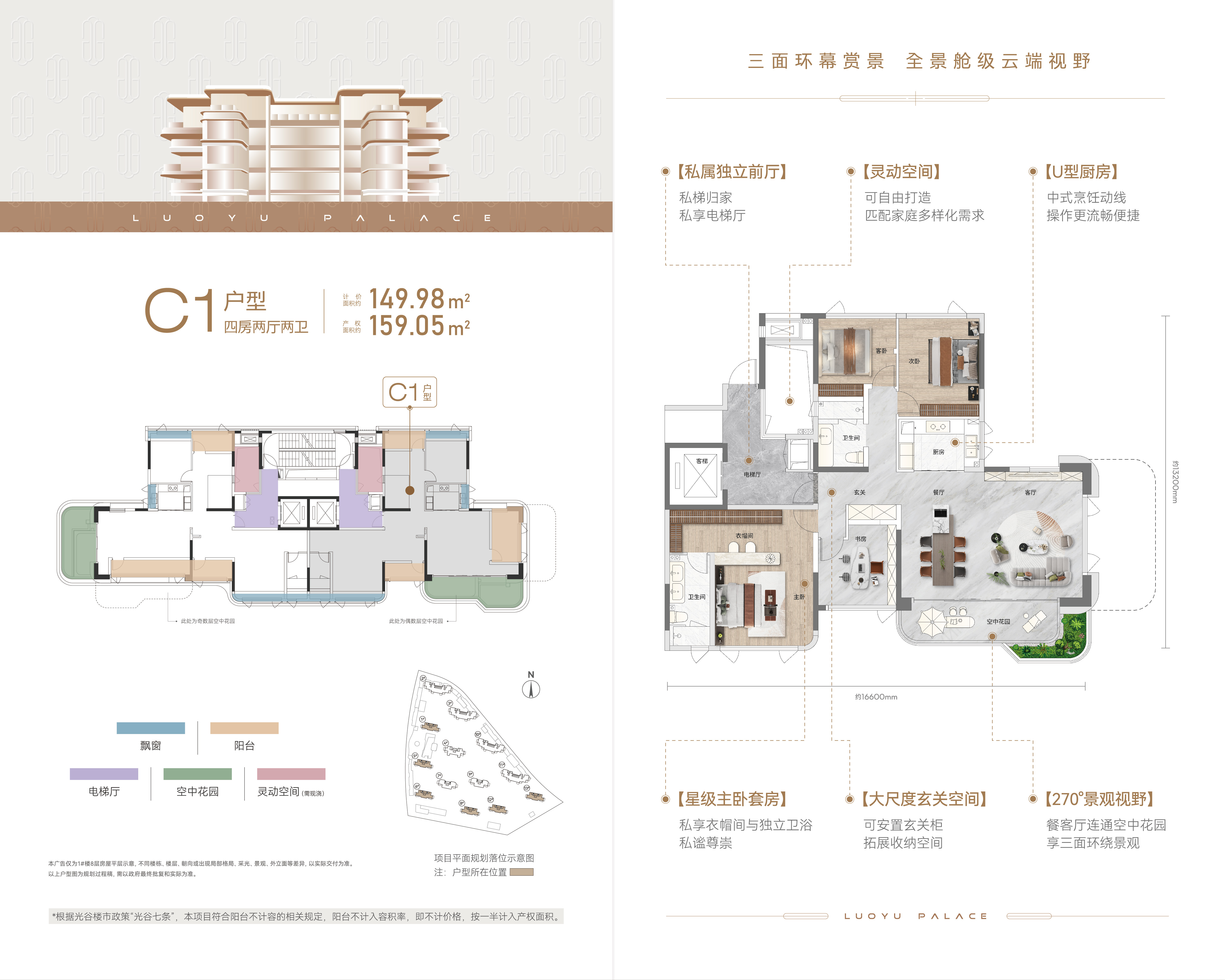 私属独立前厅:私梯归家 专属电梯厅 灵动空间:可自由打造 匹配家庭多样化需求 大尺度玄关空间:可安置玄关柜 拓展收纳空间 270°景观视野:餐客厅连通空中花园 享三面环绕景观 U型厨房:中式烹饪动线 操作更流畅便捷 星级主卧套房:私享衣帽间与独立卫浴 私谧尊崇